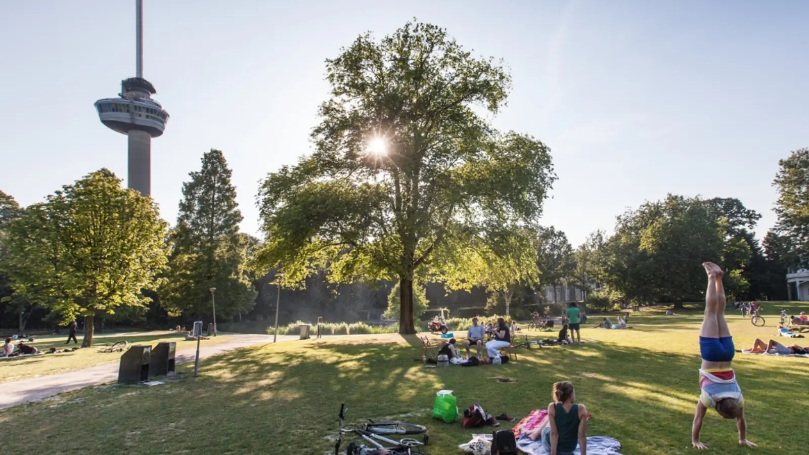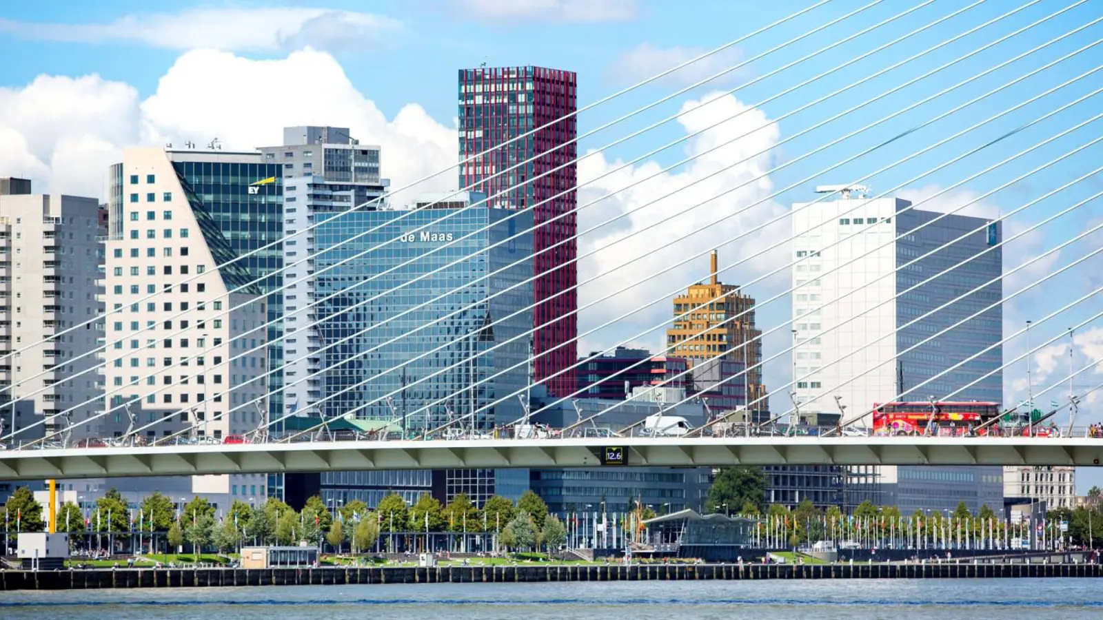 Oversiktsbilde over Rotterdam. Skog i forgrunnen, elv, skyskrapere og bro i bakgrunnen. Blå himmel med gråhvite skyer.