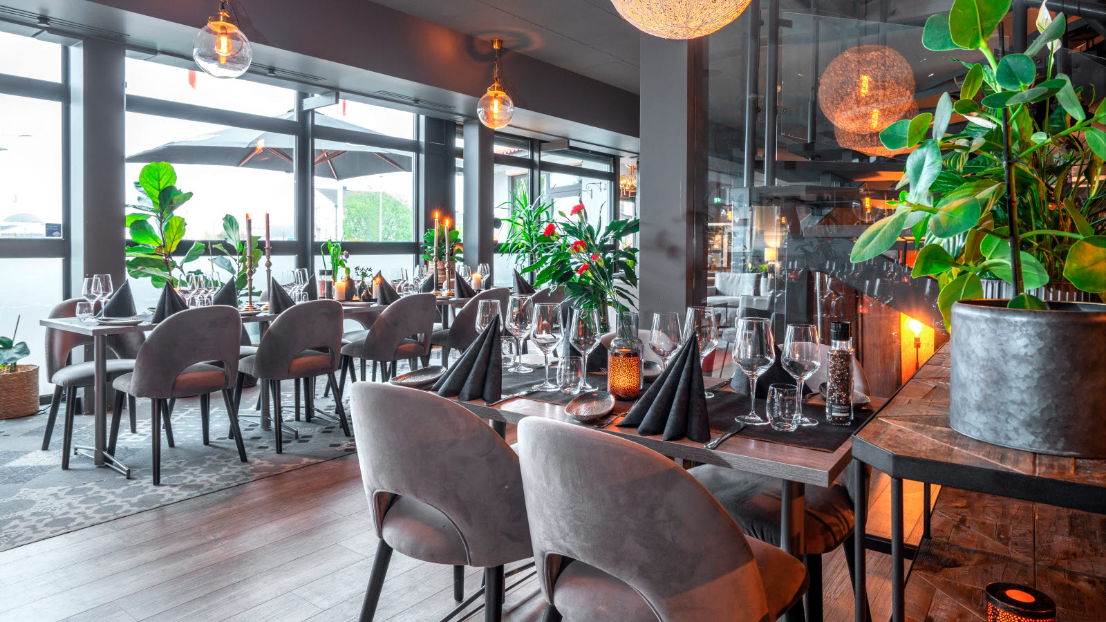 Et rom med tent lys og et bord med stoler.