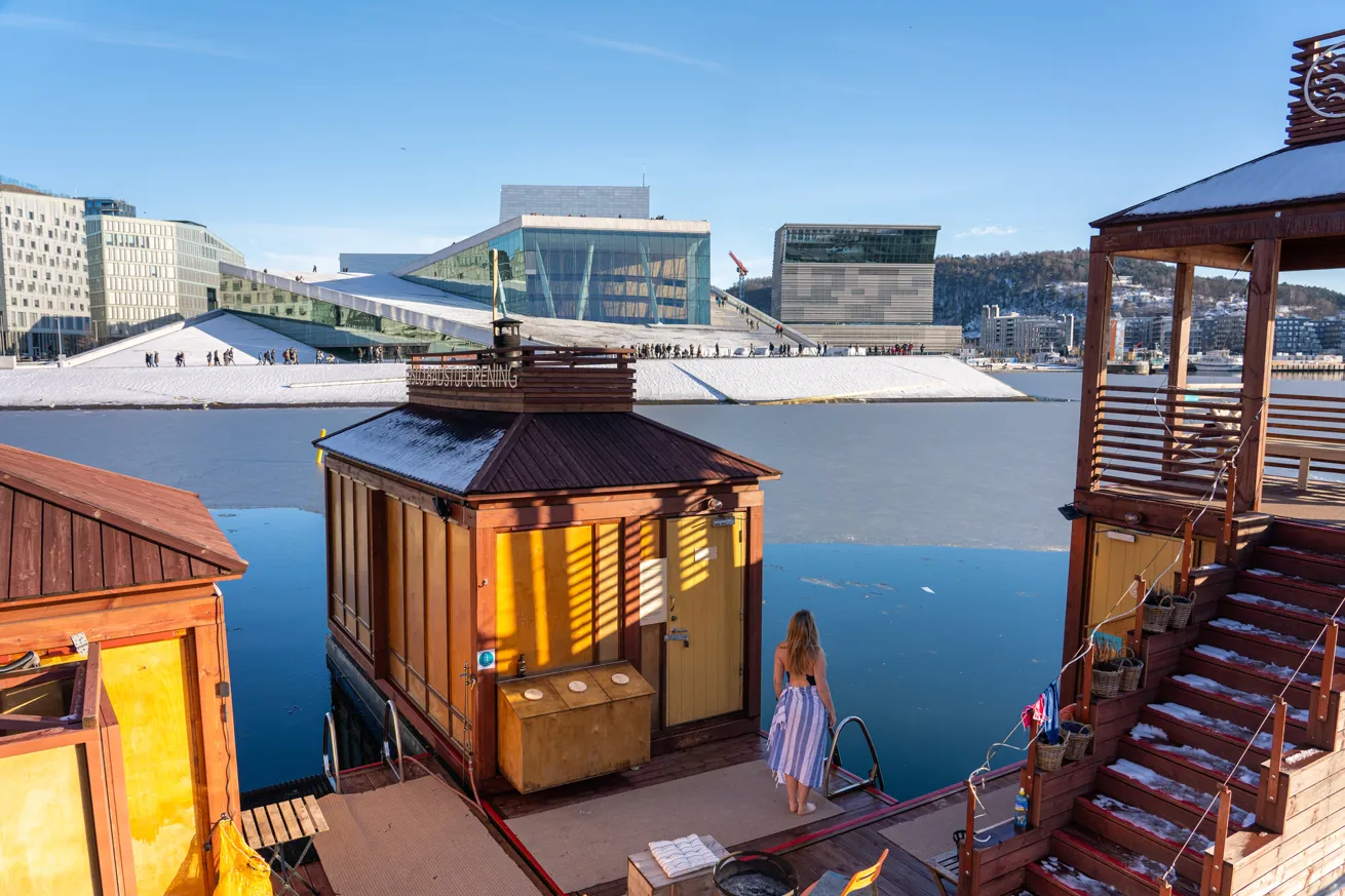 Rund av med badstue og vinterbad på Sørenga Sauna, hvor dere sitter varme og ser utover fjorden med snø i luften. En av de mest romantiske opplevelsene i Oslo.