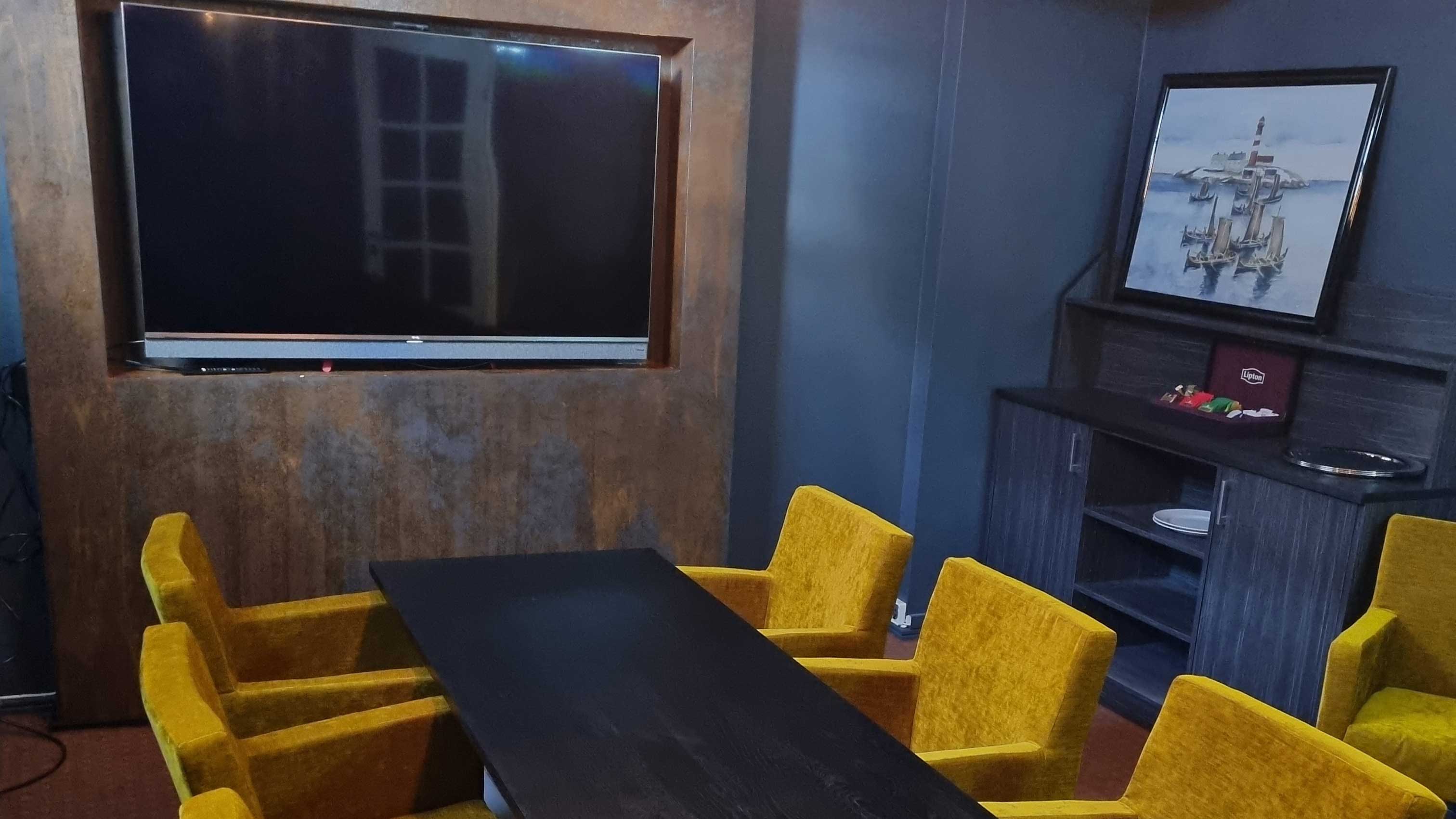 Mötesrum Salten med bord, stolar, öppen spis och projektor