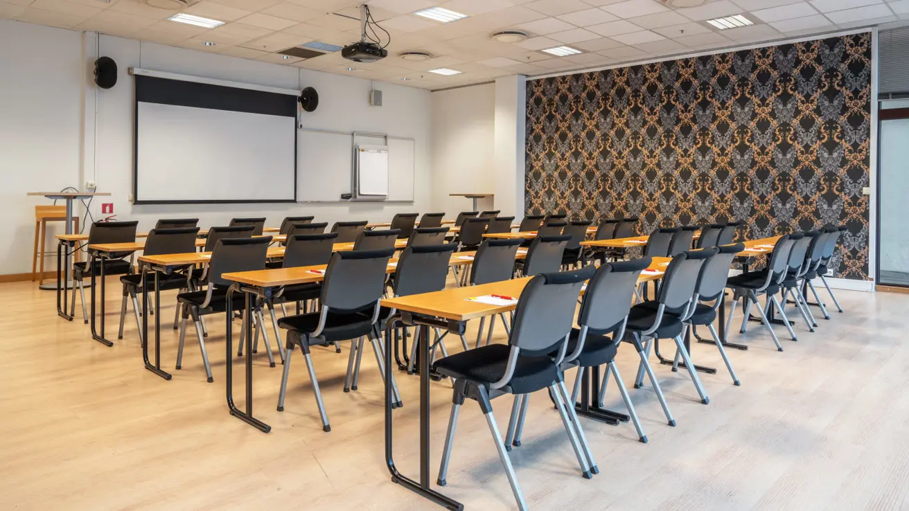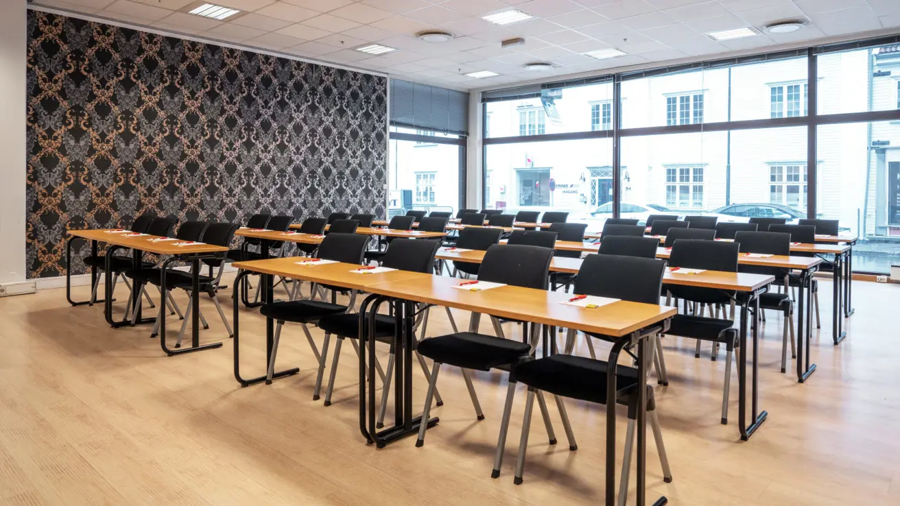 Vårt største møterom ligger i direkte tilknytning til lobby og resepsjon, og med utsikt ut mot Kristian IV’s gate. Lobbyen utgjør et flott mingle-område i pausene.