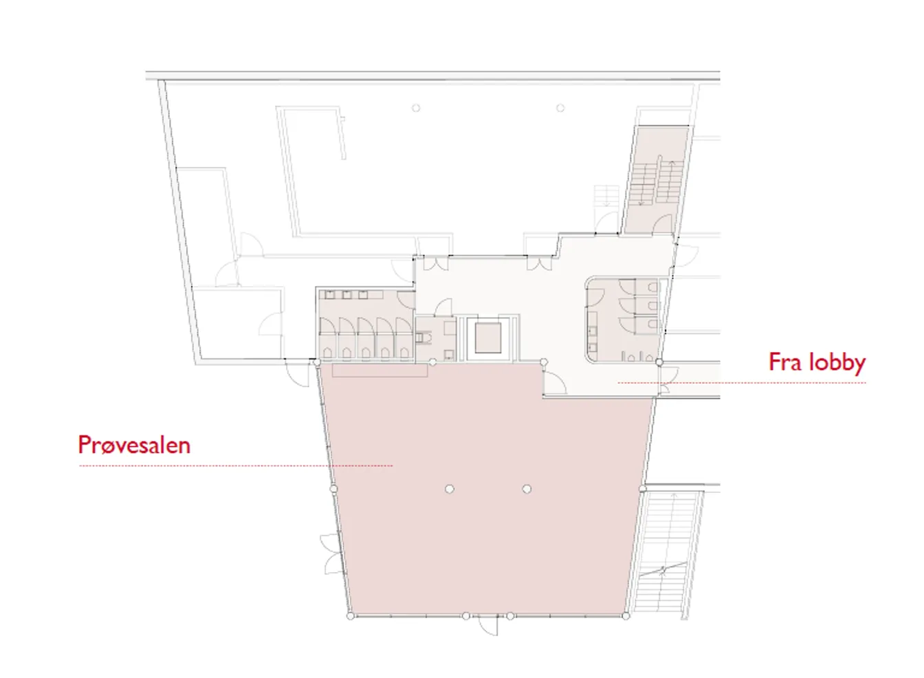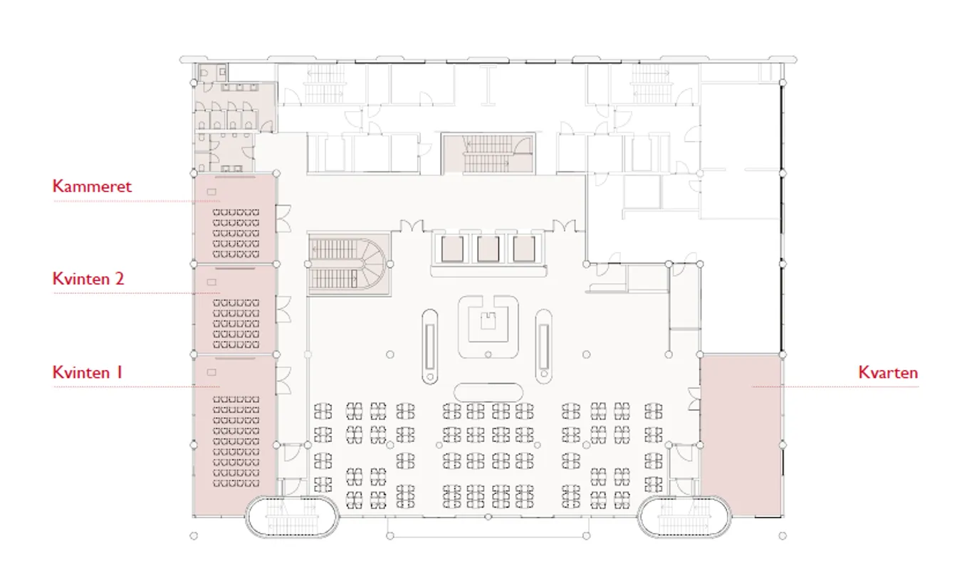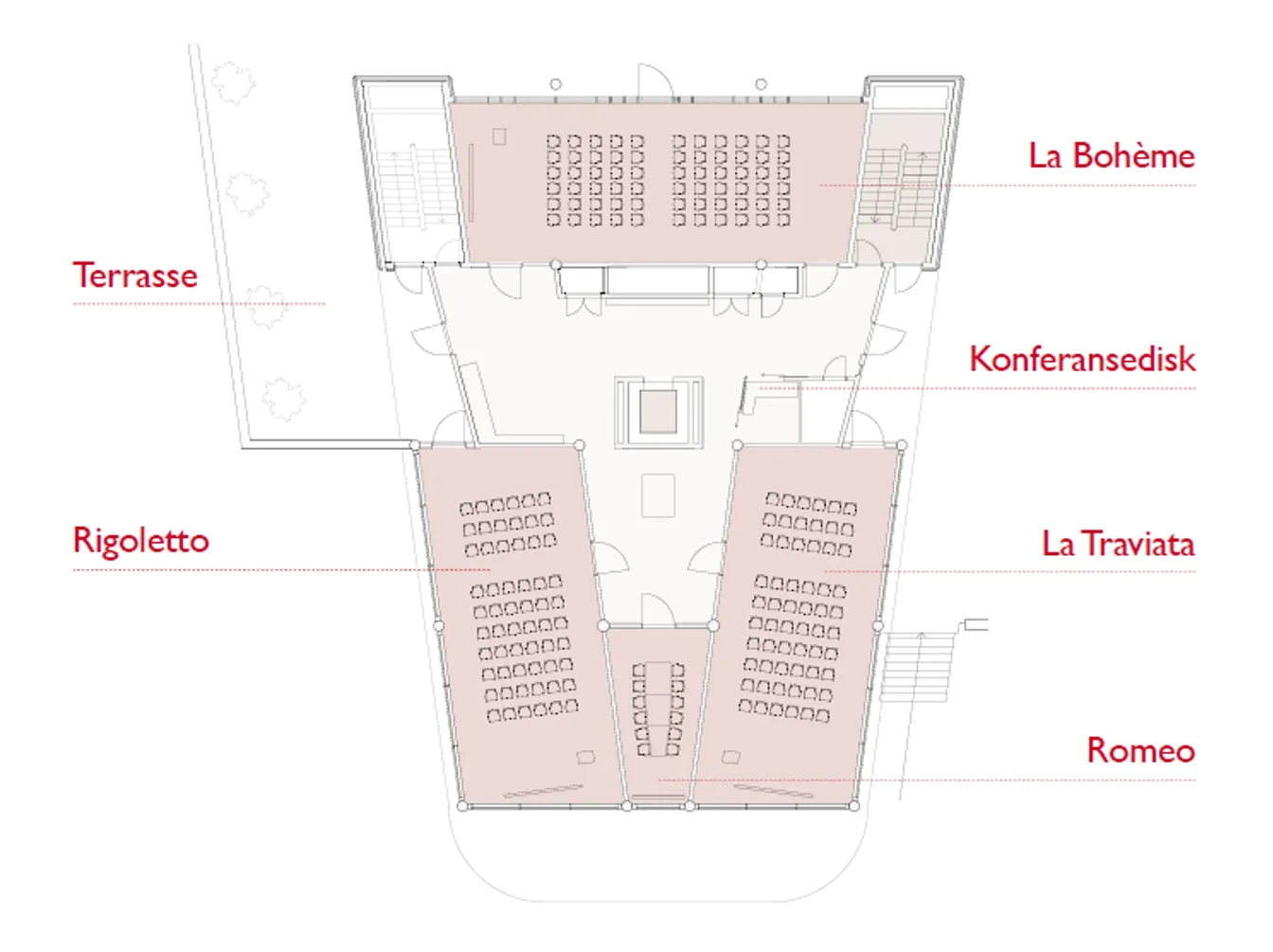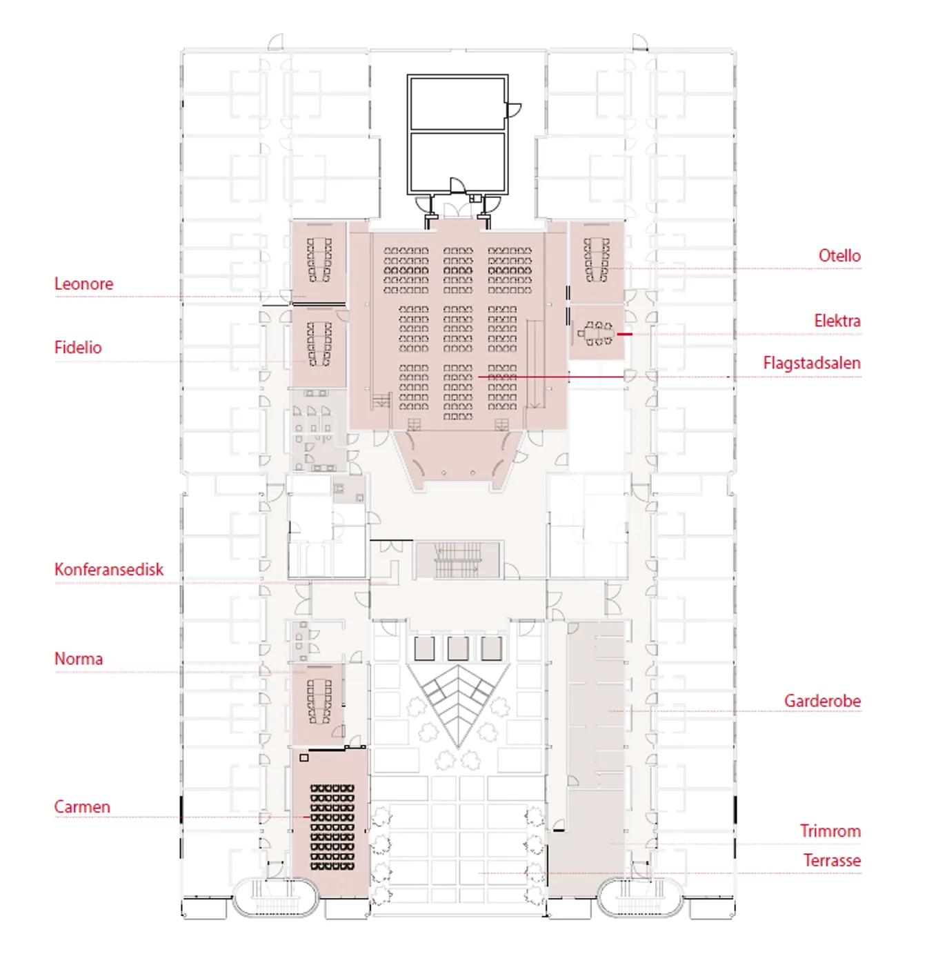 Fidelio har fast styrebordsoppsett til 12 personer. Møterommet har ikke vindu. Korridor fører til luftig terrasse og vrimleområde.