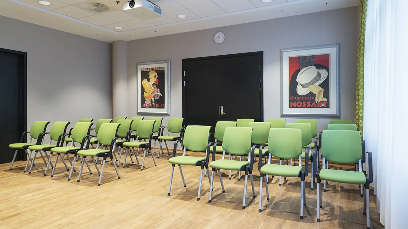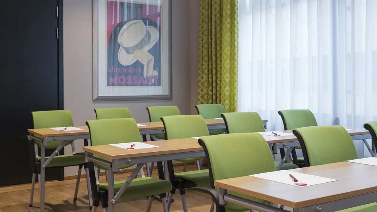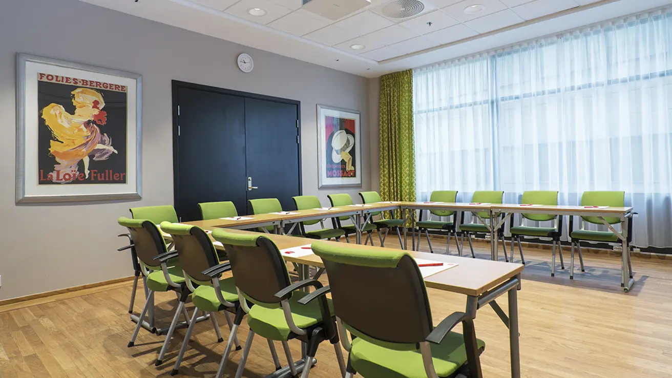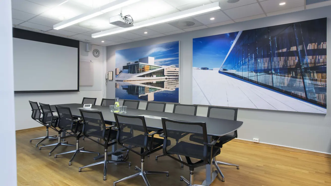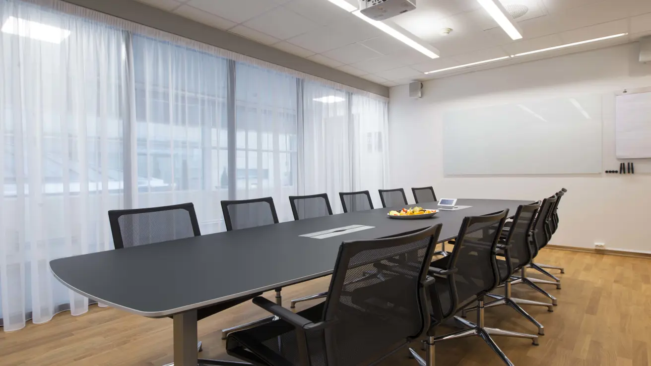 Fidelio har fast styrebordsoppsett til 12 personer. Møterommet har ikke vindu. Korridor fører til luftig terrasse og vrimleområde.